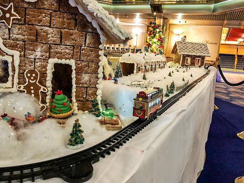 Day 4   Our room was on the same deck as the gingerbread house and train set. We passed by it every day. Today is a day at sea.