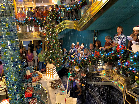 The tree is lit!   The little boy on the floor next to the Captain and the Cruise Director. Once the tree was lit, a shower on confetti/fake snow came down from the floor above us.