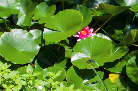 Nice!   I like this photo with the lily pads, the flower and the dragonfly.