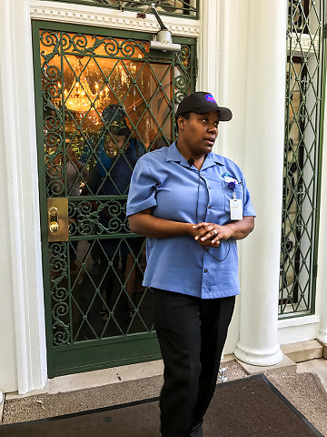 Our tour guide is telling us a bit about the house while we wait for the group ahead of us to move on. You can see them inside the door.