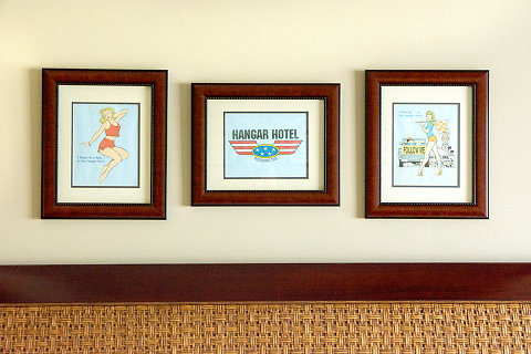 Cool pin-up photos over the bed redone as ads for the Hangar Hotel.