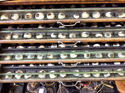 Glass eyes   The owner of the store told me there were 150 antique glass eyes in this display case. All different colors.