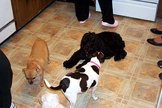 All of the dogs were cruising the kitchen, waiting for someone to drop some food. |