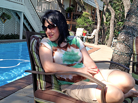 After an outfit change, she still put her feet in the pool. |