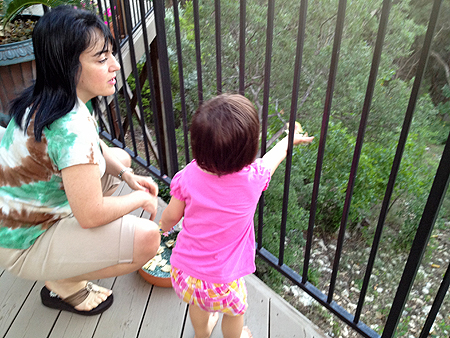 Then Chris showed her how to throw some chips off the deck for the deer. |