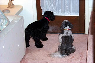 Elmo and Princess wait to go outside for the Easter Egg Hunt. |