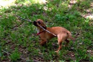 Here's Peanut having a great time. She loves to pick up anything she can carry. Then she taunts the other dogs so they come play with her. |