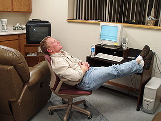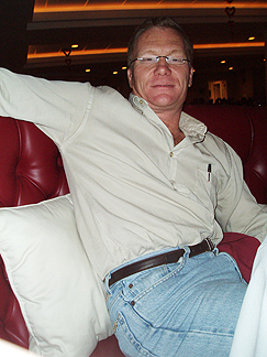 We ate dinner at the Paramount restaurant. They offered us pillows for our backs. John accepted. |