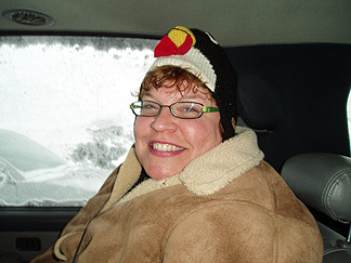 Ellen looked so cute in her penguin hat! Look at all of the snow outside of the window. |