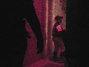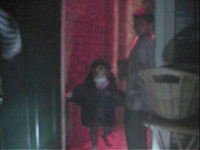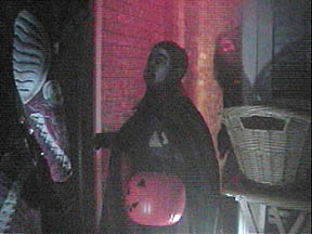 Quicktime Movie This one's a little long. There were 2 groups that came by, one after the other. The little girl at the door was scared and ran but then came back to hit me on the head when I gave her candy. You can't really see her hit me but there are a lot of screams and laughing in the video. It's pretty good. Click on the photo or here for the movie (2.8 MB Quicktime movie) |