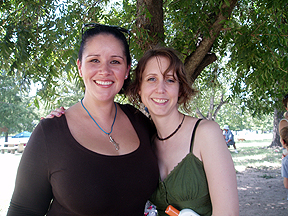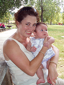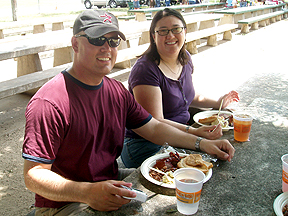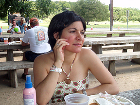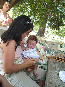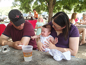 Chris, trying to give Valerie some iced tea. It was HOT outside! She enjoyed the tea. |
