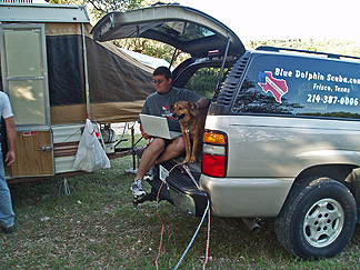 Dustin using his computer with Buddy looking on. |