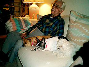 Lily, Daisy and Peanut wait with Grandpa downstairs. |