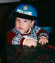 Alex likes his new police hat. |