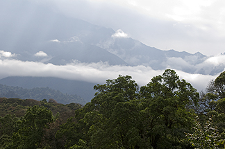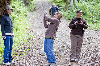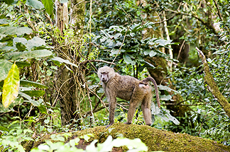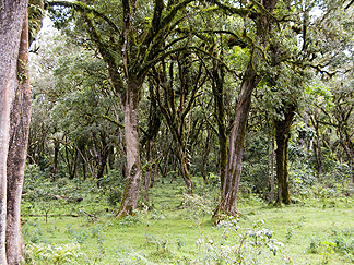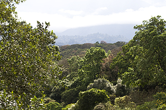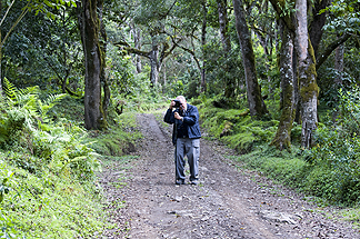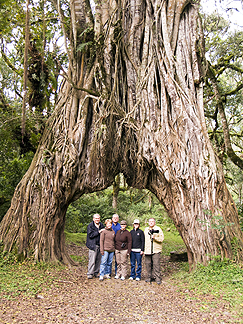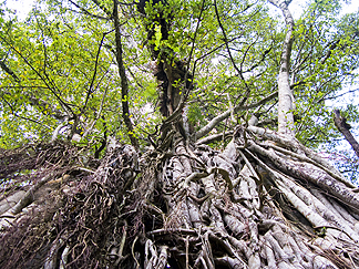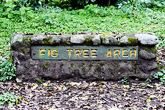 ![]() The Fig Tree Arch was formed by the parasitic wild fig. The seeds of the fig were dropped into a fork of a host tree by birds or monkeys. The seeds grow and the fig sends down roots and they slowly strangle the host tree which dies and eventually rots away leaving a hollow. In this case 2 host trees must have stood either side of the road before being smothered by the fig tree, which is now standing. |