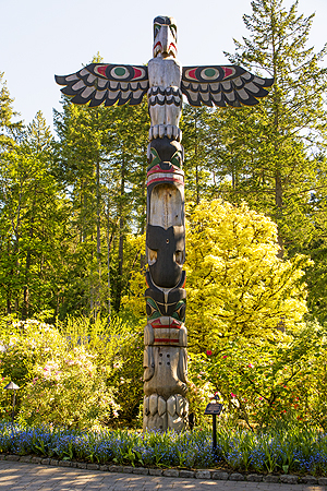 The plaque for this said the toten is: Raven, Beaver with Grouse, Otter with pups & clam, Frog. Carved for the 100th anniversary of the Butchart Gardens. |