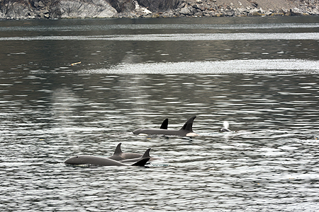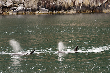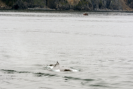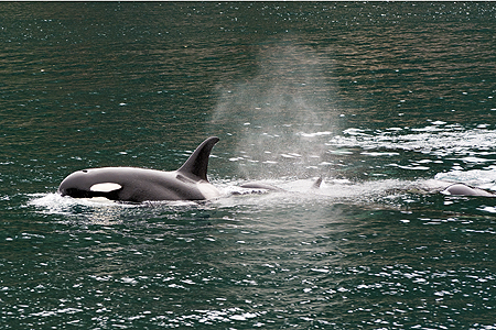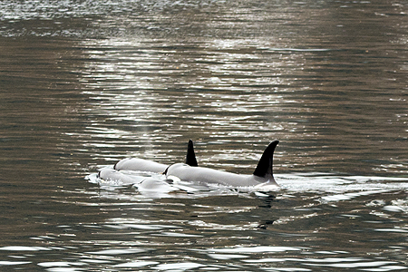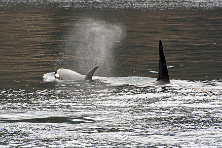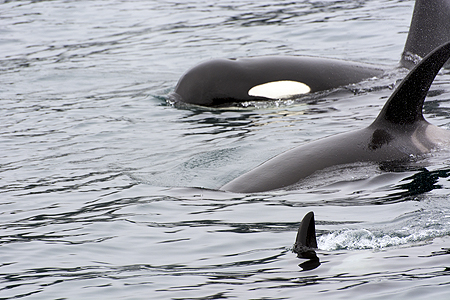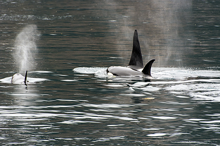 Then a weird thing happened. A humpback whale started sometimes swimming with and sometimes following the pod of orcas. The humpback is on the right. |