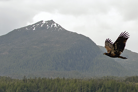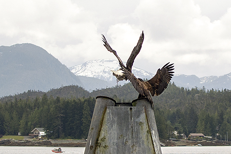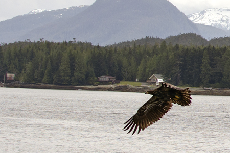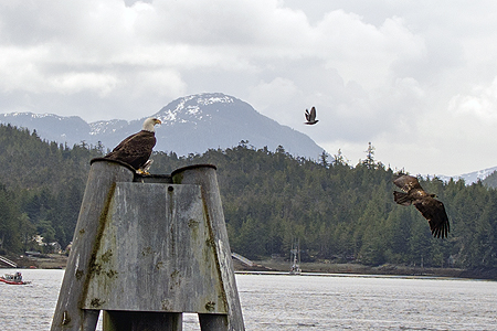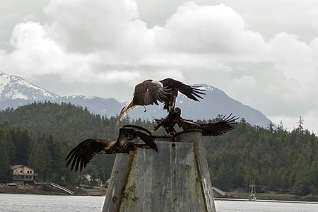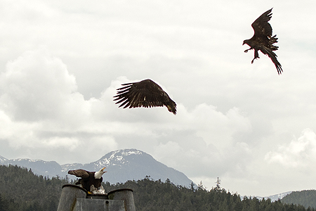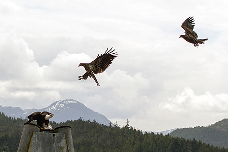 The adult eagle without the bird flew off and some juvenille bald eagles flew in and tried to take the dead bird away from the eagle. |