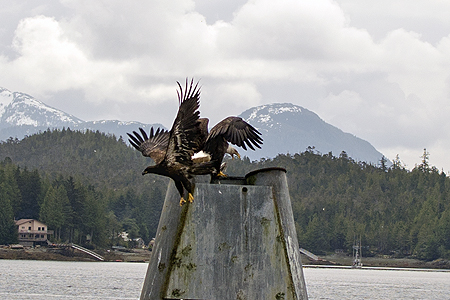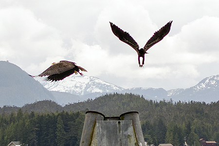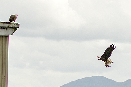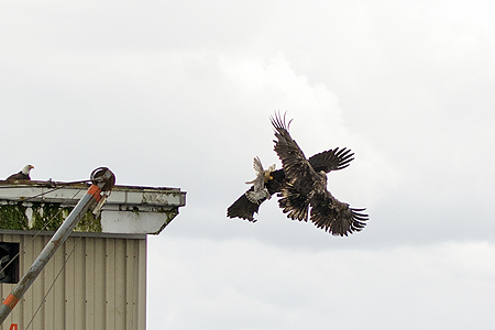You can see the other adult bald eagle on the roof behind the fight. |