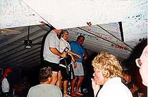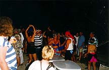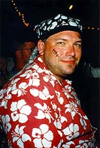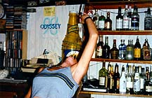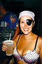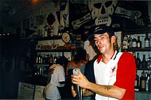 Our bartender, Ian making Pirate's Punch. Pirates Punch: 14 ounces of equal parts of spiced rum, coconut rum and peach schnapps. Add 1/2 ounce of margarita mix and 1/2 ounce of orange juice. Mix well. Top off with 1 ounce of 151 rum. |