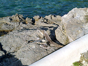 The iguana was sunning himself on the rock again. |