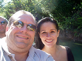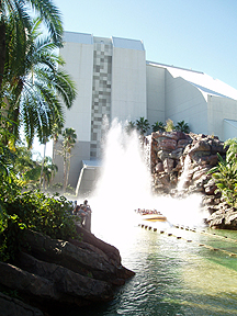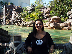 We sat in the front on the Jurassic Park ride. We didn't think twice about it until the end of the ride. We got soaked! It's hard to see in the picture but we were dripping wet. |