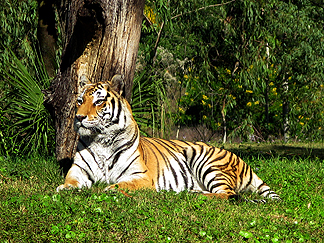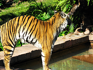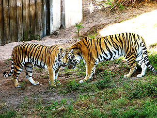 ![]() There were 2 tigers. We heard a beep and both tigers got up, stretched and walked to the side of the enclosure. |