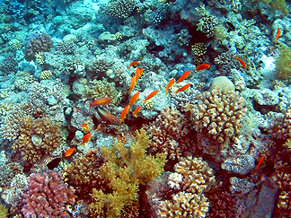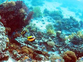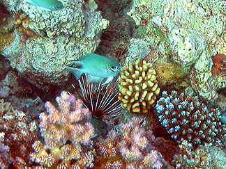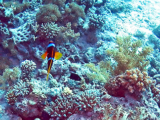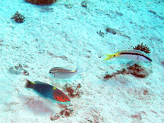 ![]() The fish with the red stripes on it's head is a Checkerboard Wrasse. |