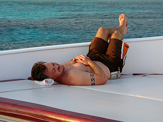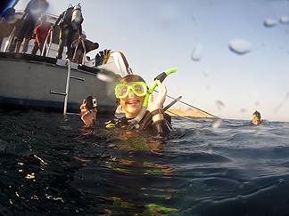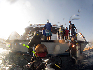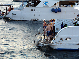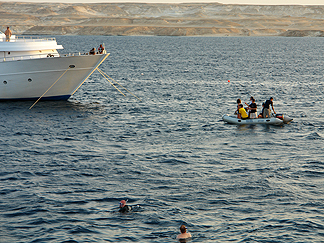 ![]() Someone from one of the other boats saw a small group of dolphins. Everyone started jumping in and getting on their zodiacs to check them out. |