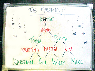 ![]() Tomorrow is our last diving day. Michael wanted us to make a diver pyramid. So, he posted a diagram of how we were going to set up. |