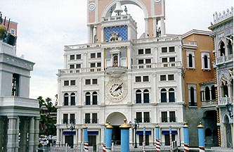 This clock tower is on the left side of the Bellagio. |