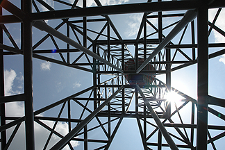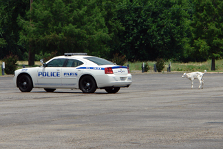 This cracked us up. In the parking lot in front of the Civic Center where the Eiffel Tower is, this calf was right behind the police car. The car would move slowly away and the calf would follow. The car moved, the calf followed. After a while the policeman got out of the car and waited until a guy with a trailer pulled up and they loaded the calf in. |