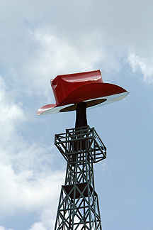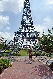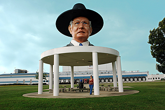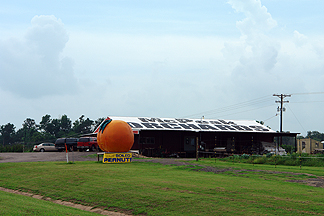 Our next stop, Pittsburg, TX where there is a giant head of Bo Pilgrim in front of the Pilgrim's Pride distribution center. Kris is in the picture so you can tell how big it is. |