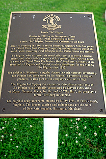 The plaque next to the giant head talks about Bo Pilgrim and the statue of him that is sitting on a bench underneath the head. |