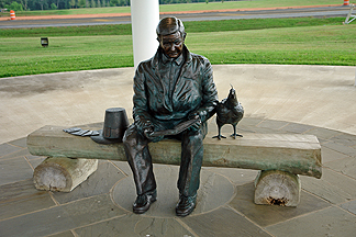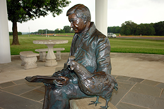 The statue shows Bo Pilgrim, who was very religious, reading his own personal bible. Next to his hat are "Good News for Modern Man" brochures in English and Spanish which he distributed to millions worldwide. |