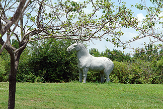 A terra-cotta horse statue by the Koi pond. |