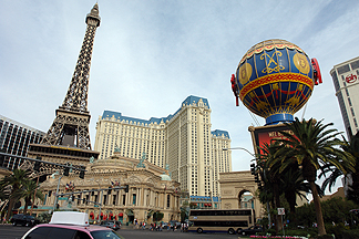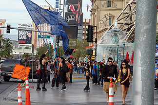 We were walking to the Bellagio when we saw these guys, in tights, on rollerblades with big flags. We don't know what they were promoting. It just looked funny. |