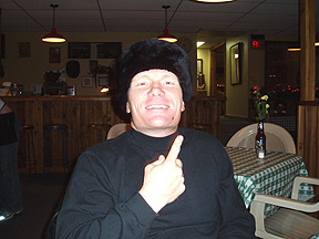 John in his Cossack hat and pointing out his run-in with his razor. |