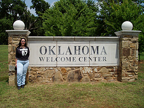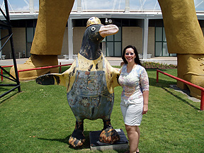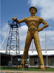 Before heading out of Tulsa, we stopped to see the "Golden Driller" at the Tulsa Fair Grounds. It cracked us up that there's an oil-covered penguin in front of him. You can just see Kris next to the penguin. |
