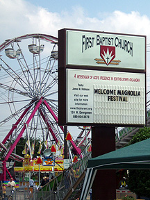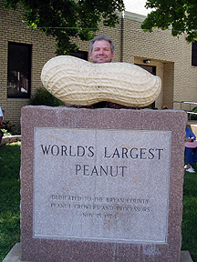 The first place we hit was Durant, Oklahoma where the World's "Largest" Peanut was right in front of City Hall. ("largest" in quotes because there is a larger one in Georgia) We drove around downtown for a few minutes and couldn't find it but they were having a Magnolia Festival. |