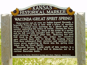 This historical marker was very cool. It says, "Many moons ago, so runs and Indian legend, Waconda, a beautiful Princess, fell in love with a brave of another tribe. Prevented from marriage by blood feud, this warrior embroiled the tribes in battle. During the fight, an arrow struck him as he stood on the brink of a spring and he fell mortally wounded in to the waters. Waconda, grief stricken, plunged after him. Believing her soul still lived in the depths, the tribes for countless ages carried their sick to drink the healing waters. Here they celebrated their victories and mourned their losses, never neglecting to throw in to the spring some token for the Great Spirit." |