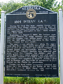 This historical marker marks where Sioux, Cheyenne and Arapaho Indians made concerted attacks on wagon trains and ranches along the Oregon Trail for 400 miles. It chronicles how many people were killed and even names of some women and children who were taken captive. |