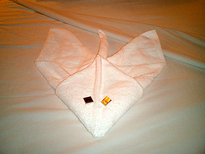 Our cute little towel stingray the steward made for us that night. |