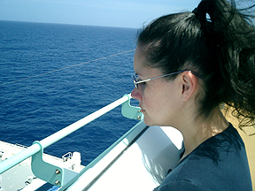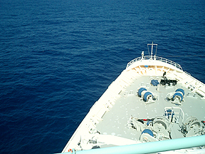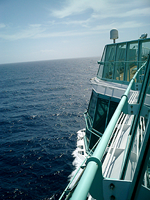 We went walking up to the front of the ship. The railing was almost too high for me to see over. |