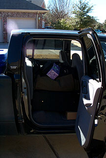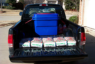The back of the truck loaded up. The blue bins are in case we bought anything big that wouldn't fit in the back of the truck. The 5 bags in the front of the picture are bags of sand that Bill brought in case we got stuck in snow. He also brought a sleeping bag, an axe, an air pump, 2 cans of fix-a-flat and pliers. I teased him endlessly about his "survival kit". Especially about the sleeping bag and the sand. |