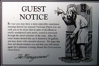 This sign on the wall cracked us up. It says that they've done their best to soundproof the cars but they wanted us to "be aware that, in spite of all efforts to totally soundproof each parlor, sound is conveyed through the metal structure of the rain." |