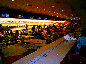 The hotel has a bowling alley on the second floor. We thought it would be fun to go bowling after Bill's big win but all of the lanes were taken. |