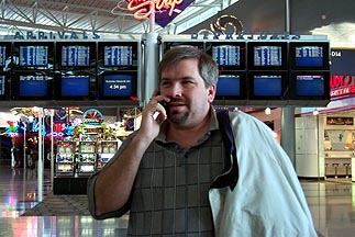 Bill had to call the office as soon as we landed. |