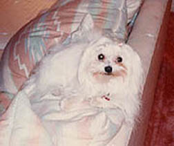 We hadn't really planned on getting another dog but look at that baby face. We bought Daphney about four months before we got married. She weighed eight ounces when we bought her. She now weighs 5 pounds. Daphney is a female, pure-bred Maltese. She's a delight. She never went through that destructive puppy phase and it only took her a month or so to get house broken. She's even better now. On the rare occasion that she does something bad, she gives herself a time out. She'll go sit in a corner by herself for about two hours (much longer than we would punish her). When she thinks she's done enough time, she'll come and apologize to us. It works both ways though. If we do something that makes her mad she'll hold it against us for hours. |